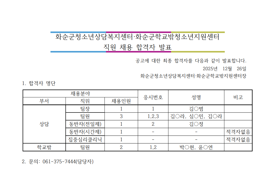 2026 화순군청소년상담복지센터·화순군학교밖청소년지원센터 채용 합격자 공고