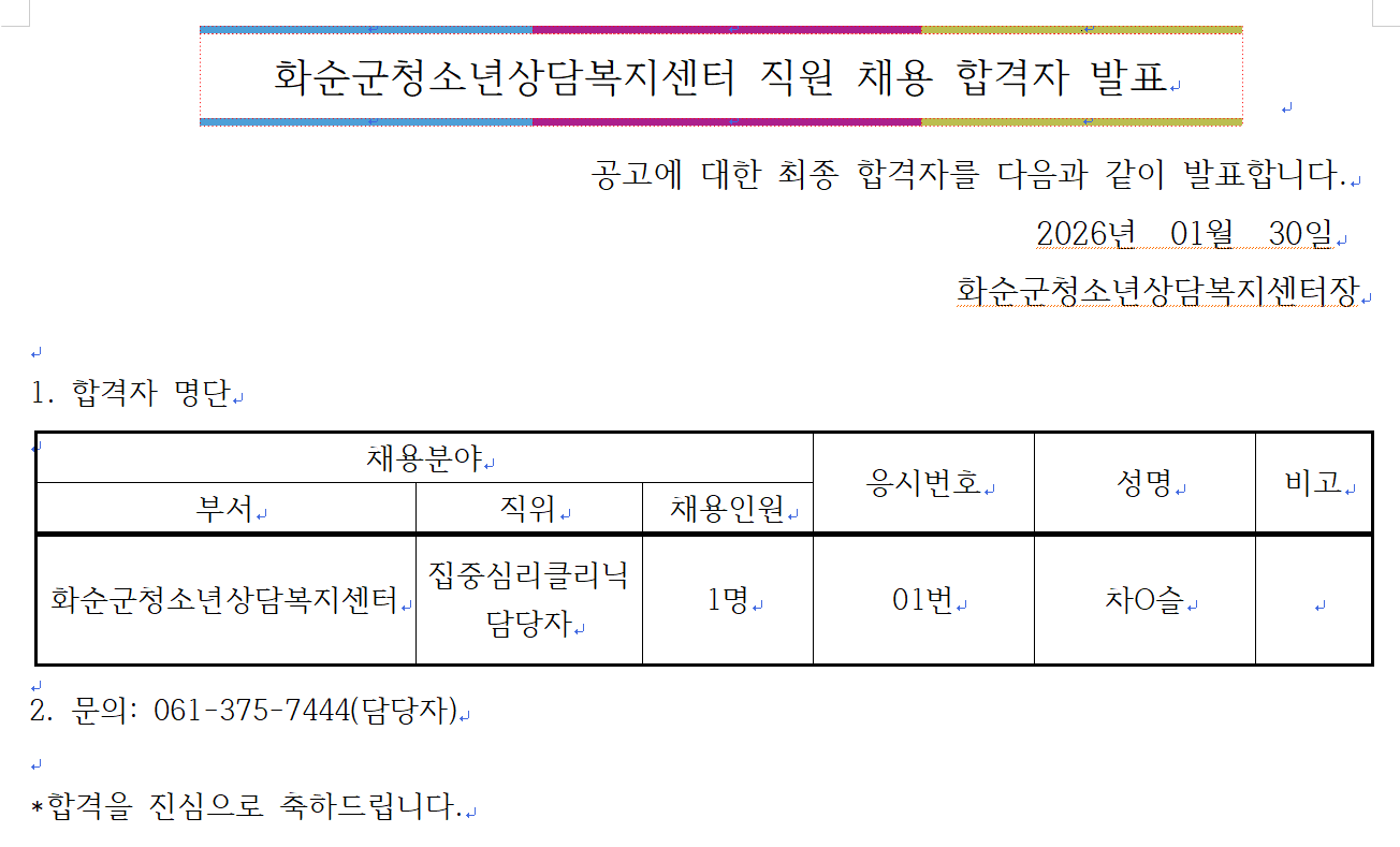 화순군청소년상담복지센터 채용 결과 보고(집중심리클리닉 담당자)