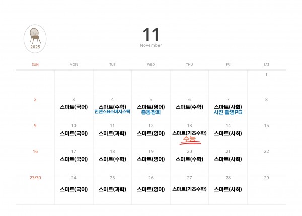 화순군학교밖청소년지원센터 11월 일정표 입니다